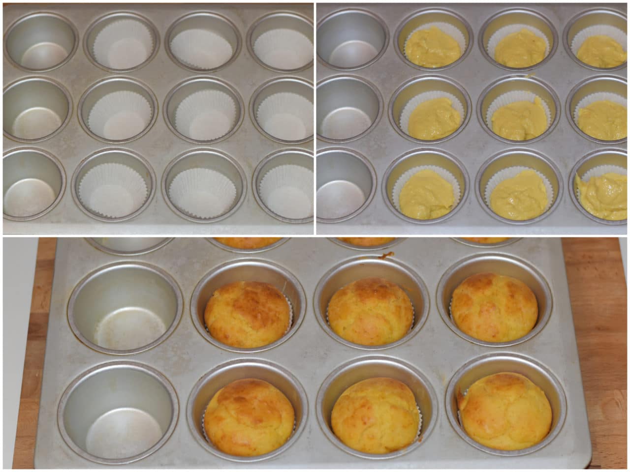 Distribuite il composto negli stampini per muffin rivestiti con pirottini di carta, riempiendoli fino a 1-2 cm dal bordo, poi cuocete per 20-25 minuti in forno statico preriscaldato a 180°C.