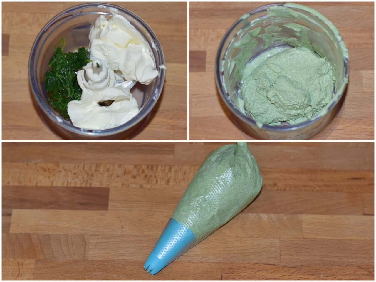 Unite in un mixer il Philadelphia con gli spinaci ben strizzati e un pizzico di sale e frullate fino ad ottenere una crema liscia, quindi trasferitela in una sac-à-poche dal beccuccio a stella.