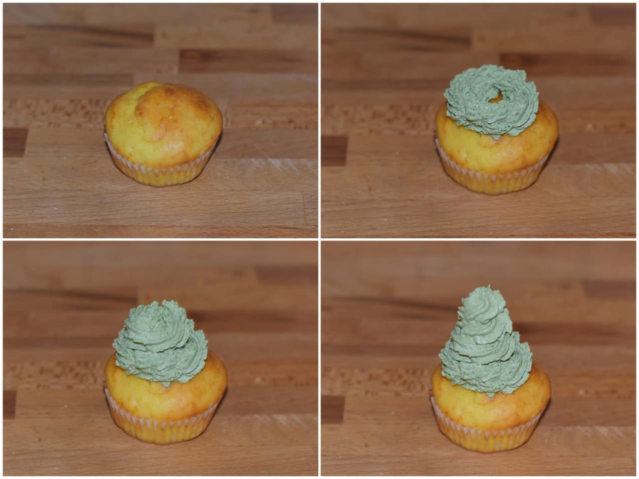 Create i vostri alberelli in cima ai cupcakes, creando delle piccole piramidi di cerchi sovrapposti, sempre più piccoli.
