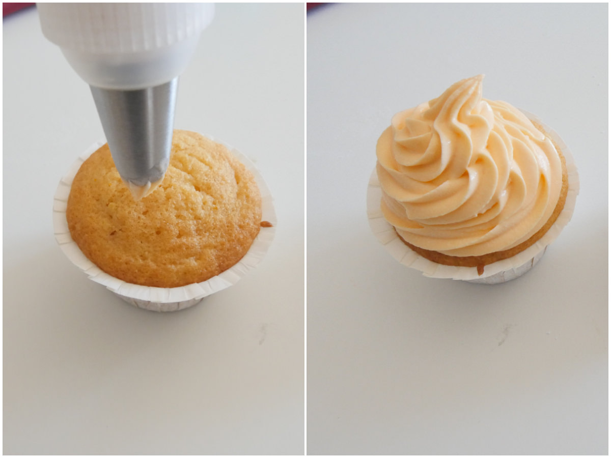 Quando le tortine saranno completamente fredde, recuperate il frosting dal frigo e procedete con la decorazione, usando una sac-à-poche con il beccuccio a stella.