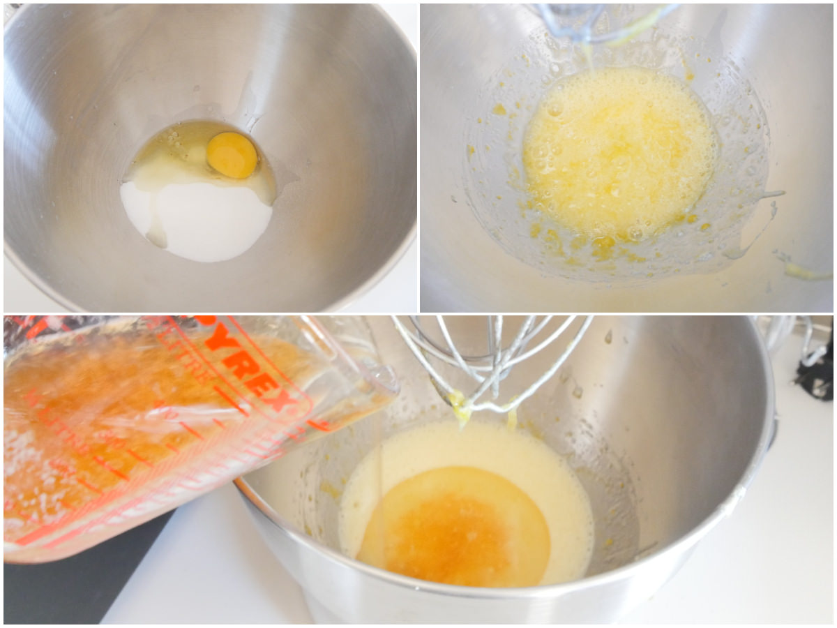 Innanzitutto preparate le tortine: montate l'uovo con lo zucchero fino ad ottenere un composto chiaro e spumoso, quindi aggiungete a filo prima olio e succo di arancia, poi anche il mix di prosecco e Aperol.