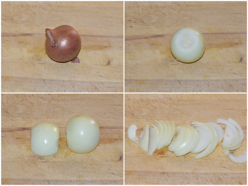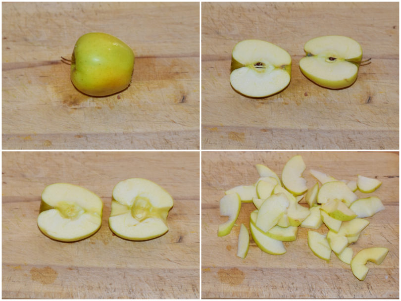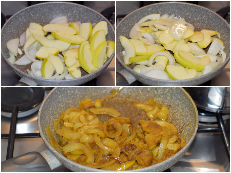 Mondate la cipolla e tagliatela a fettine; lavate bene la mela, tagliatela a meta, eliminate il tortolo centrale e tagliate a fettine anch'essa.