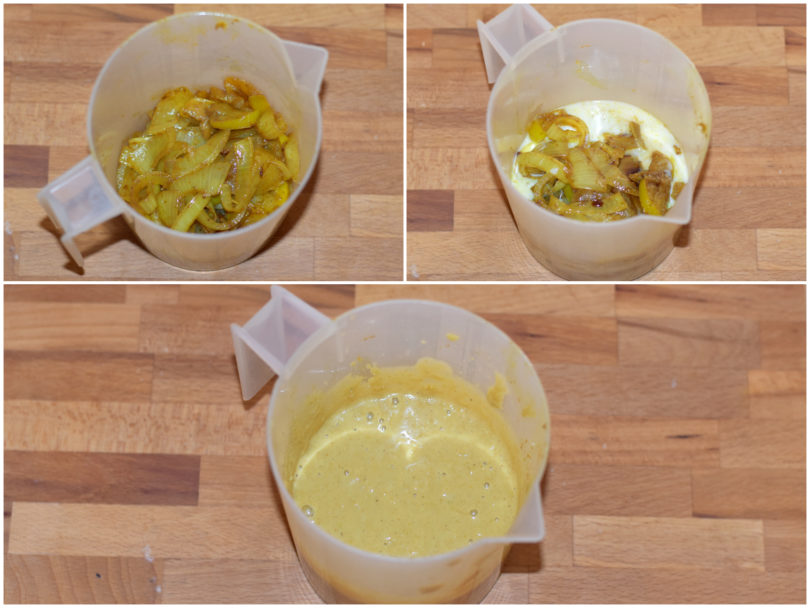 Quando saranno cotte versate mele e cipolle in un contenitore idoneo al minipimer (di solito sono stretti e lunghi), unite il latte e la salsa di soia e frullate fino ad ottenere una crema liscia, poi regolate di sale se serve.
