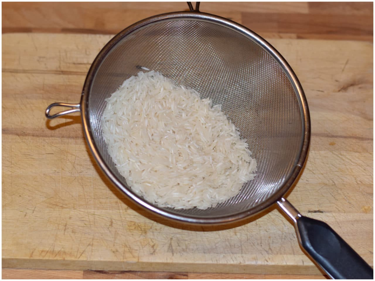 Innanzitutto sciacquate il riso sotto acqua corrente finché l'acqua non uscirà limpida, in modo che il riso perda il suo amido.