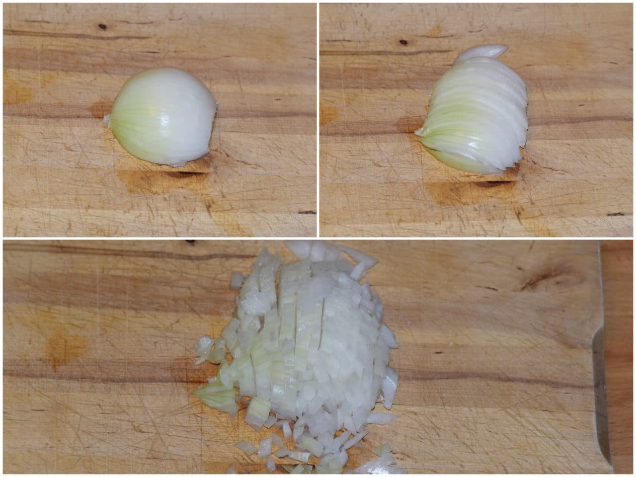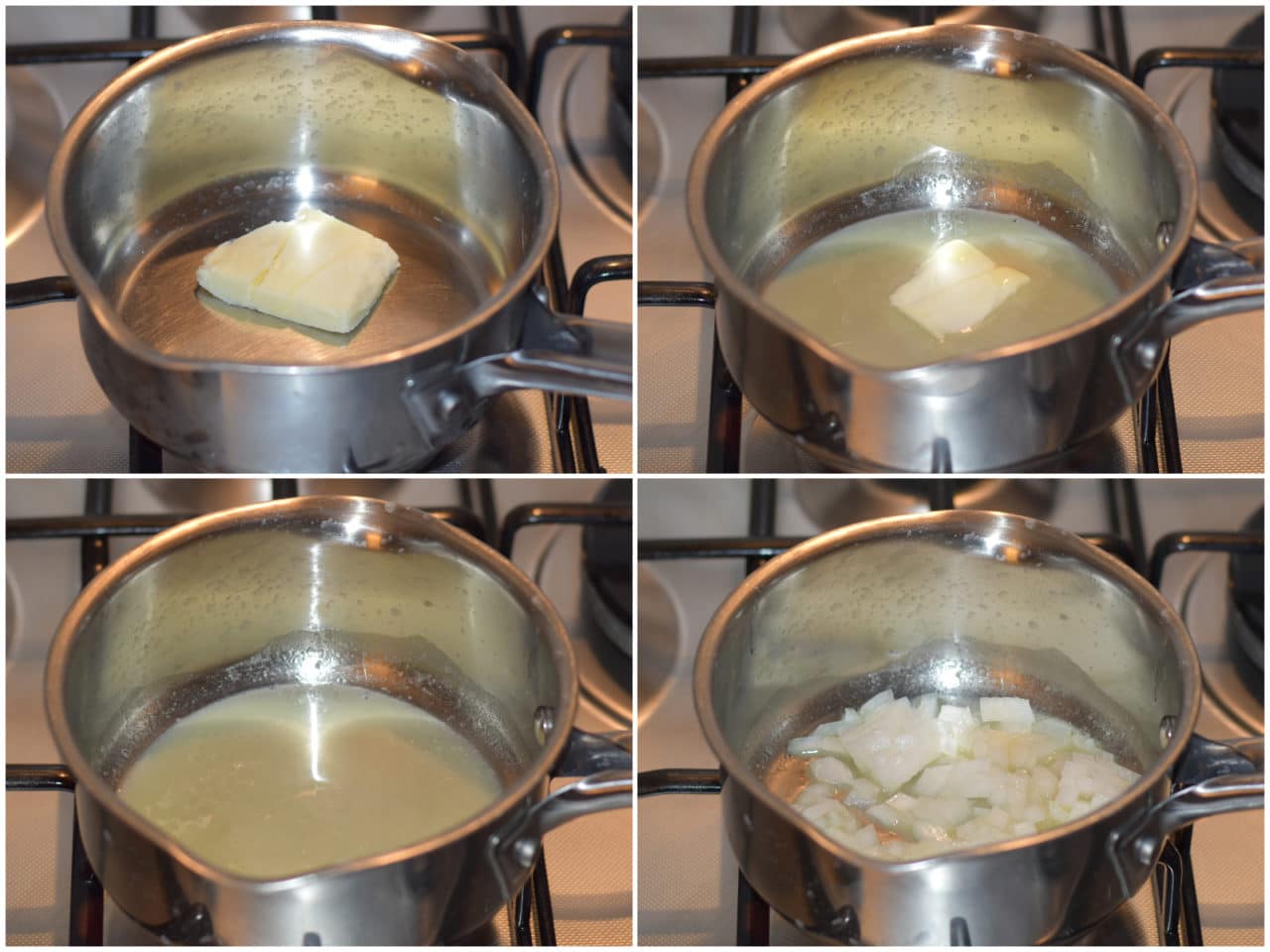 Mondate la cipolla, tritatela e fatene appassire metà (senza arrivare a farla dorare) in una casseruola con il burro.