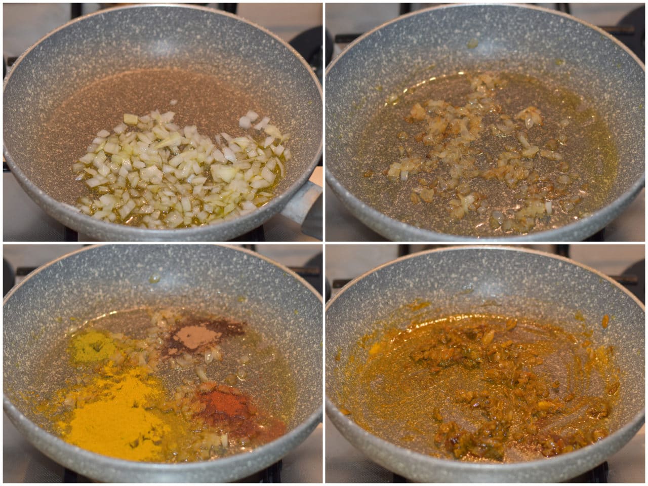 Nel frattempo che il riso cuoce procedete con i ceci: fate dorare la cipolla in un'ampia padella antiaderente con l'olio, poi unite le spezie (tranne il pepe) e lasciate insaporire.