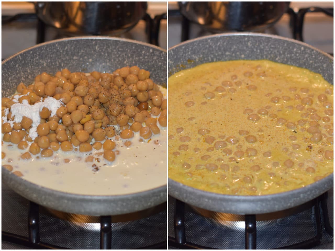 Aggiungete anche ceci, latte di cocco, maizena e pepe e mescolate a fiamma bassa finché il sughetto non si sarà addensato formando una cremina.