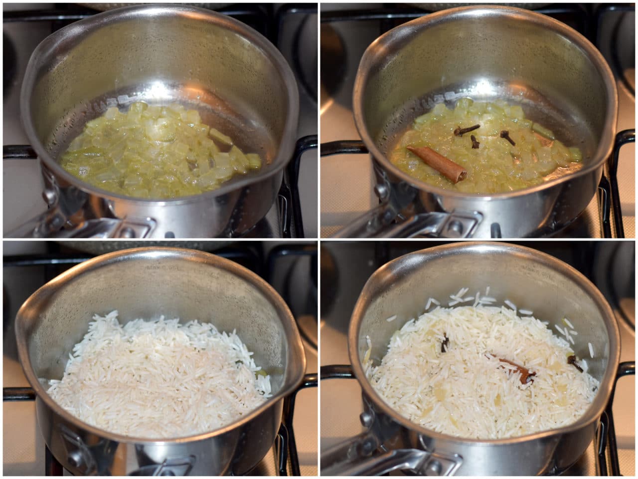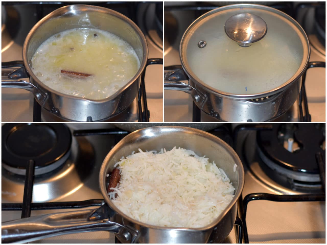 Aggiungete cannella e chiodi di garofano e lasciate insaporire, poi unite anche il riso, fatelo tostare per qualche minuto, quindi unite il brodo già caldo, chiudete con coperchio e lasciate cuocere per circa 15 minuti (o fin quando il riso non avrà assorbito tutto il brodo)a fiamma medio-bassa senza mescolare.