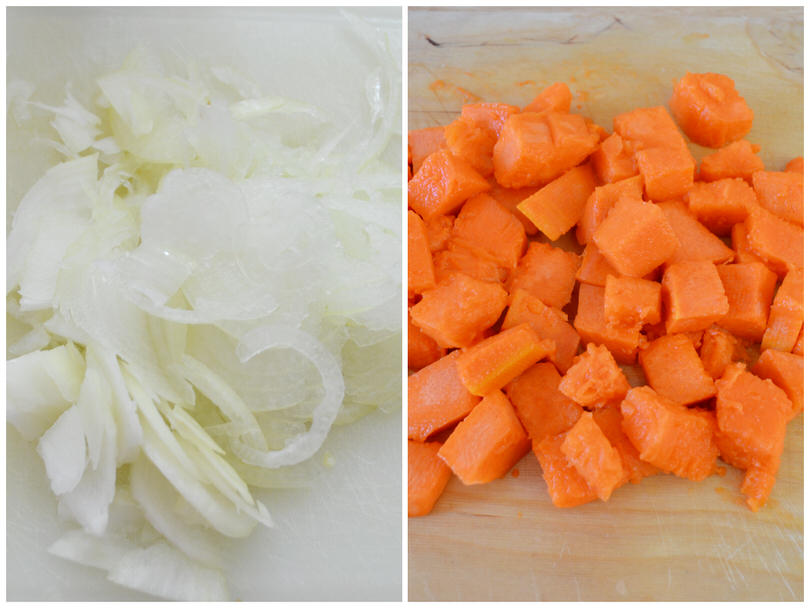 Pulite la zucca, quindi tagliatela a dadini. Affettate la cipolla a velo.