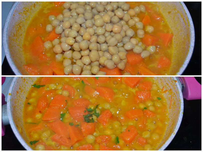 Aggiungete ora i ceci lessi, mescolate e fate cuocere fino a quando il liquido non sarà stato assorbito.Aggiustate di sale e pepe.