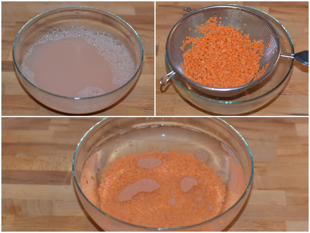 Preparare gli ingredienti: pelate lo zenzero e grattugiatelo, mondate e tritate la cipolla, sciacquate bene le lenticchie finché l'acqua non diventerà trasparente.