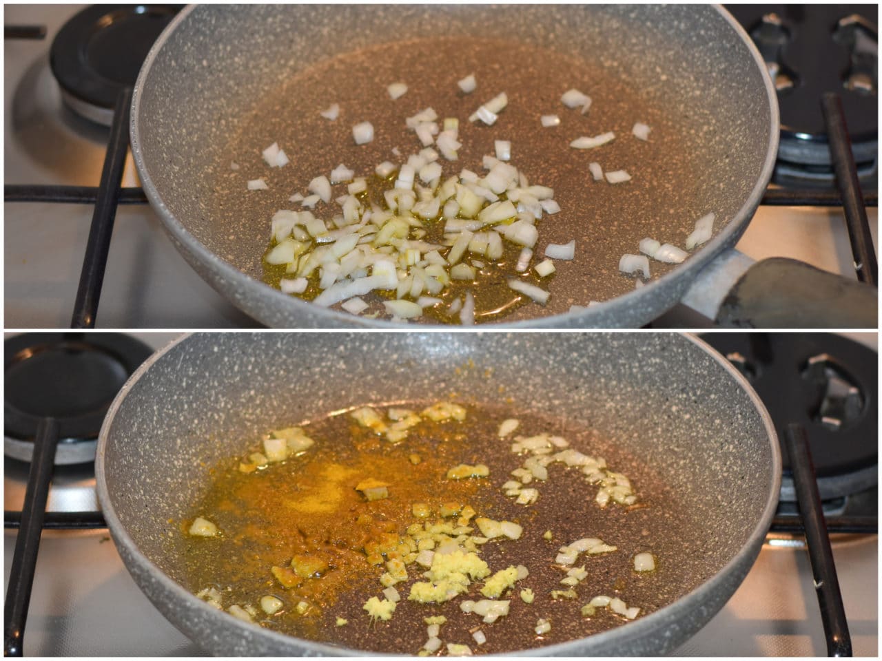 Fate dorare la cipolla in un'ampia padella antiaderente con un po' di olio, poi unite zenzero e curry e lasciate insaporire.
