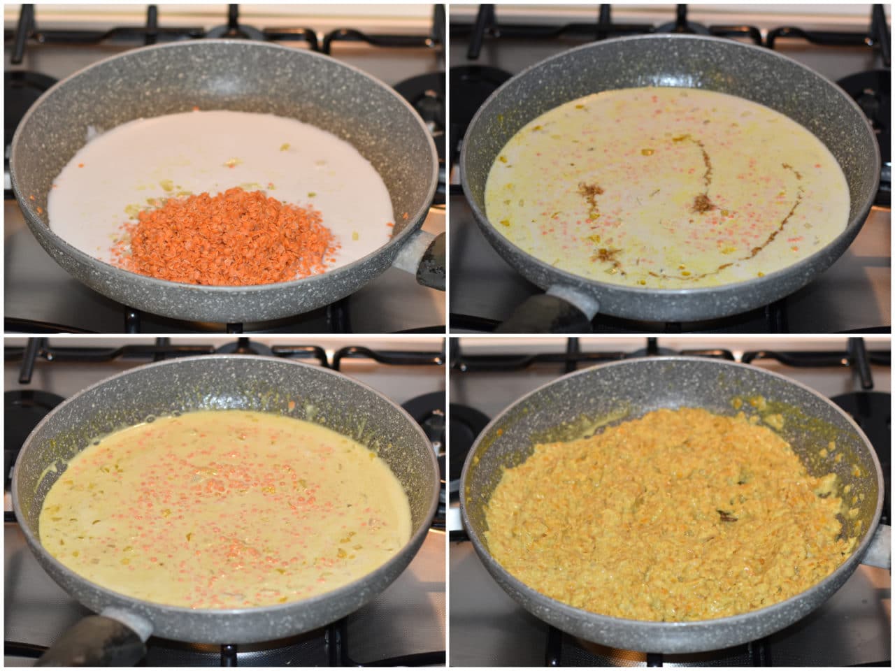 Aggiungete le lenticchie e il latte di cocco, condite con la salsa di soia e lasciate cuocere a fiamma medio-bassa per almeno 15 minuti o finché le lenticchie non avranno assorbito tutto il latte.
