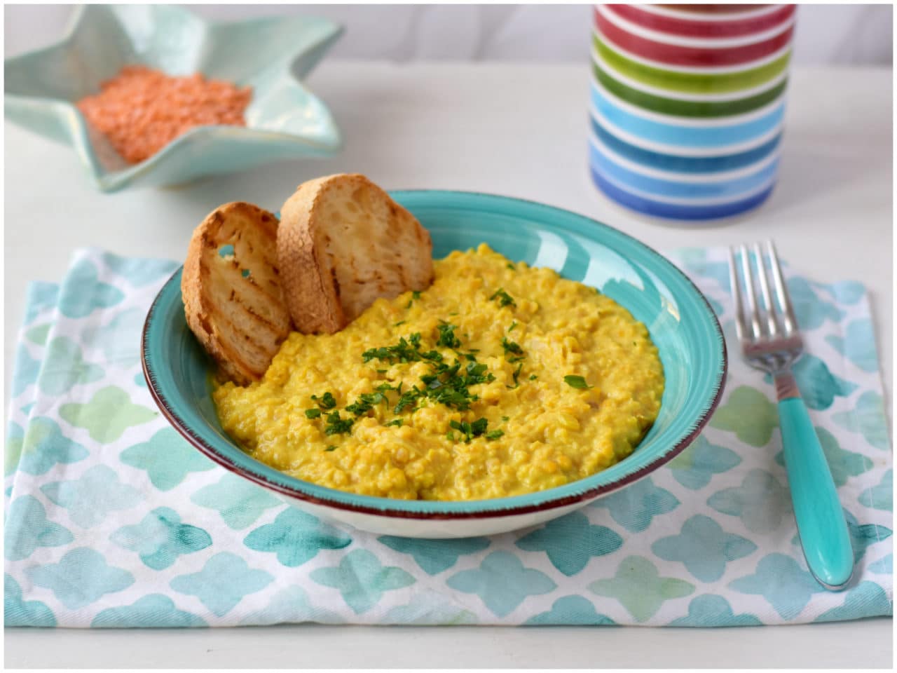Il dahl di lenticchie è pronto, servitelo con il pane tostato o con altro a piacere.
