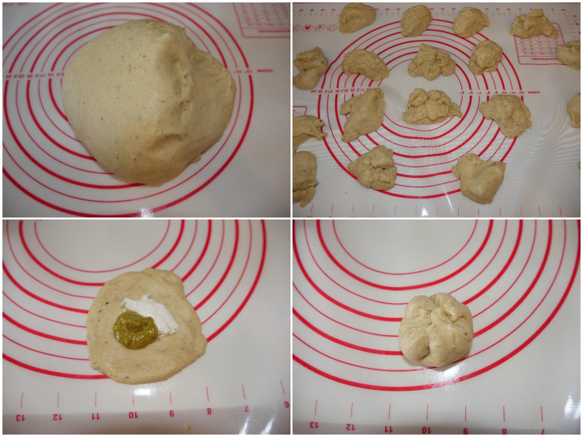 Prendete un pezzetto per volta, appiattitelo, farcitelo con un pochino di pesto e di mozzarella e richiudete l'impasto sul ripieno, sagomandolo a pallina.