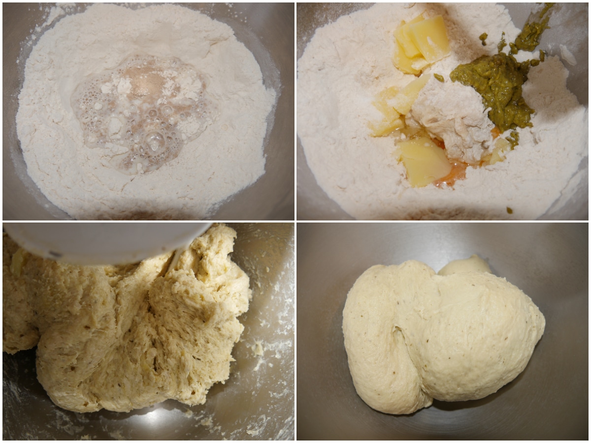 Sciogliete il lievito e lo zucchero nel latte, uniteli alla farina e iniziate ad amalgamare, quindi unite burro a pezzetti, uovo, sale e pesto e continuate a lavorare fino a far incordare l'impasto sul gancio.