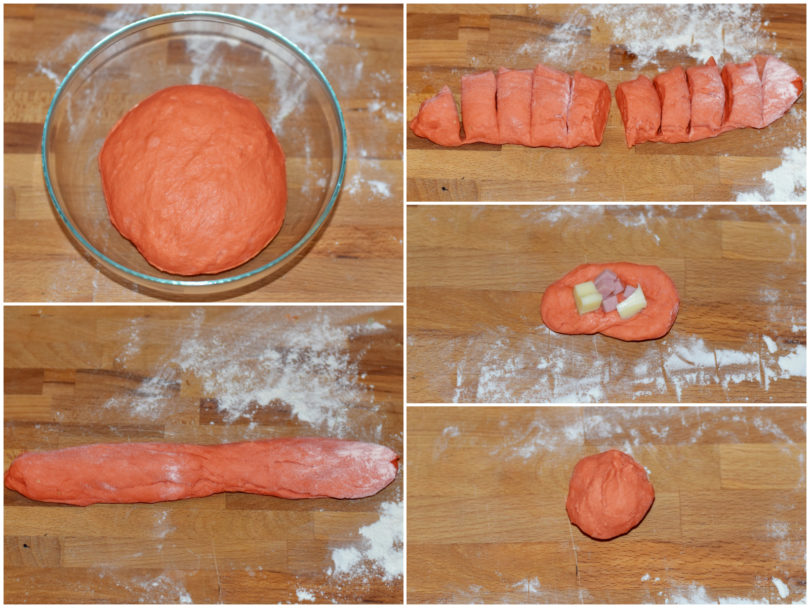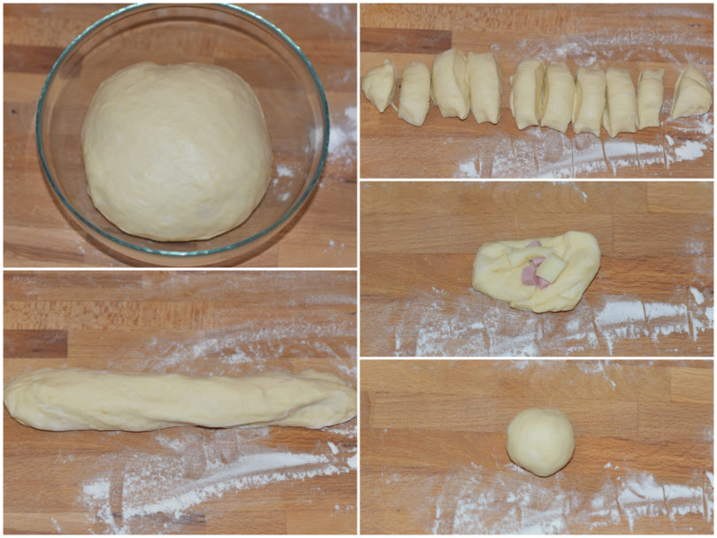 Schiacciate ogni tocchetto con le mani, farcite con qualche cubettino di formaggio e prosciutto e richiudete l'impasto sul ripieno per creare una pallina.