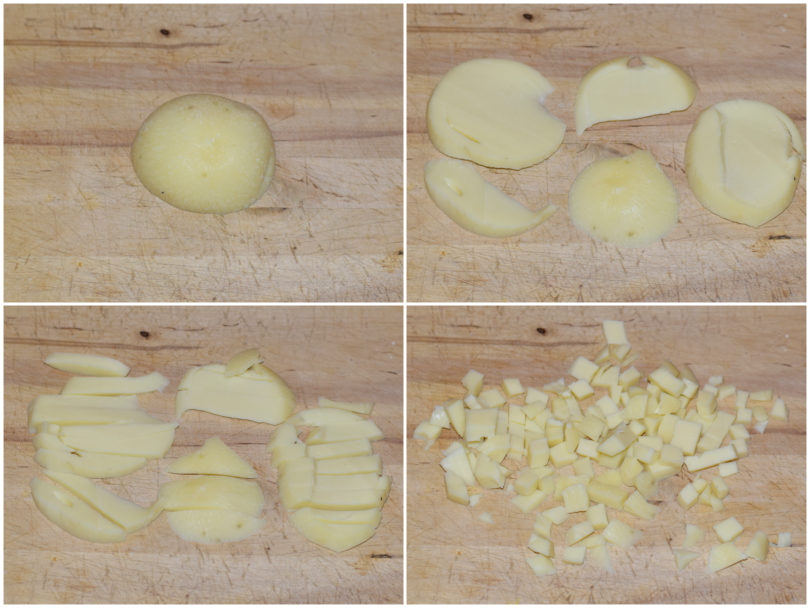 Quando i 3 impasti saranno almeno raddoppiati di volume preparate gli altri ingredienti, tagliando sia formaggio che prosciutto a cubettini.