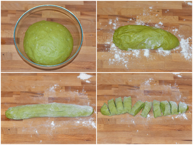 Prendete un impasto per volta, sgonfiatelo con le mani e dividetelo in 10 tocchetti uguali tra loro.