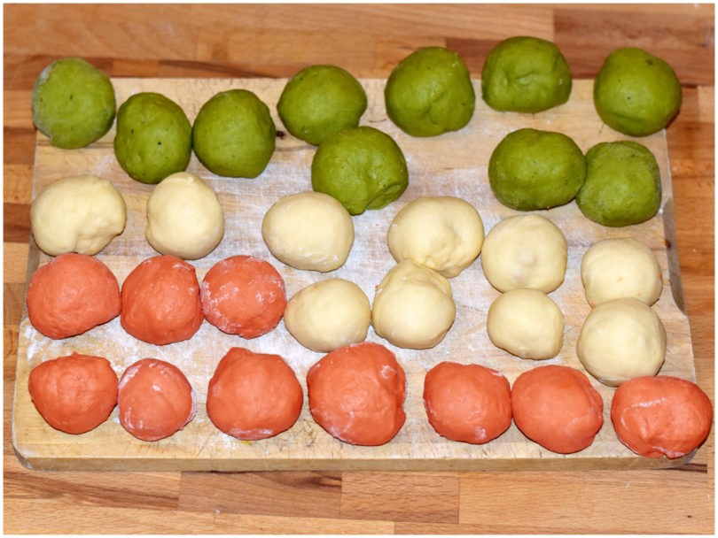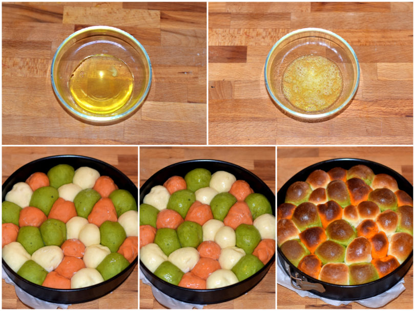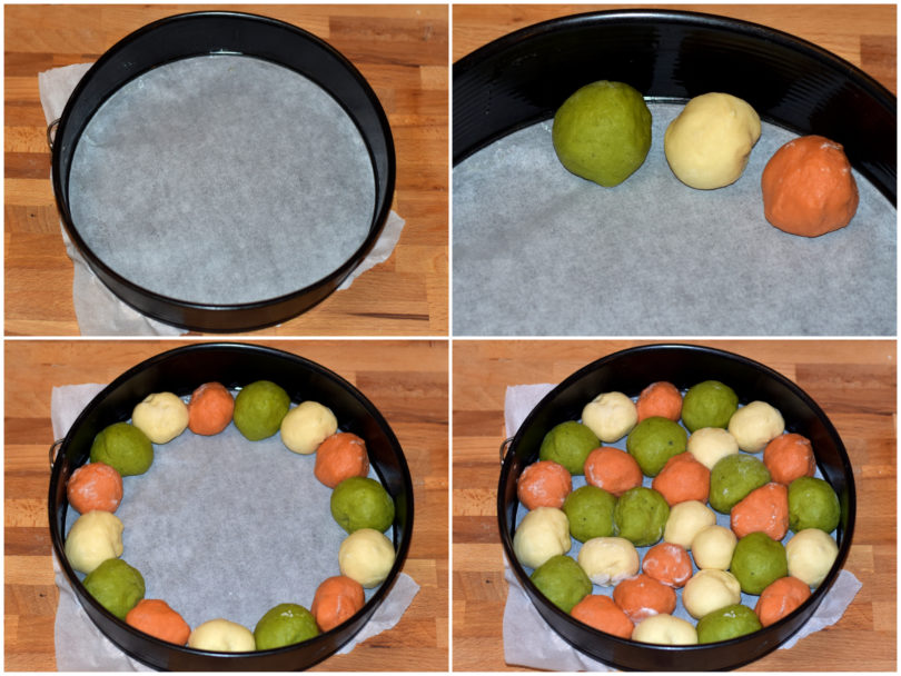 Una volta ottenute le vostre 30 palline di 3 colori diversi disponetele nello stampo rivestito di carta forno e leggermente unto, cercando di alternare i colori tra loro, poi lasciate lievitare ancora per almeno 30 minuti, sempre nel forno spento con lucina accesa.