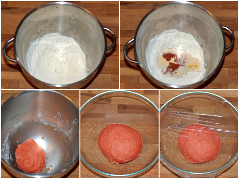 Versate farina, sale e zucchero in una ciotola, versate al centro lievito e composto rosso e lavorate fino ad ottenere un panetto omogeneo.