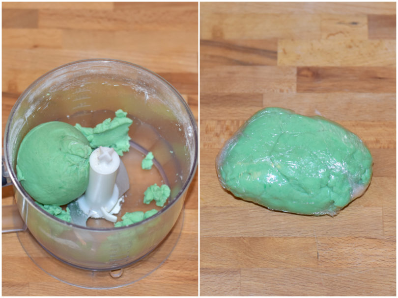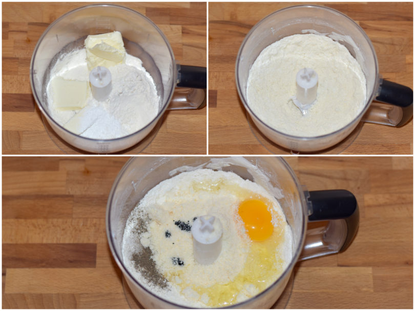 Mettete in un mixer farina, lievito e burro e lavorate fino ad ottenere un composto sabbioso, quindi incorporate sale, pepe, grana, uovo e colorante alimentare e frullate ancora.