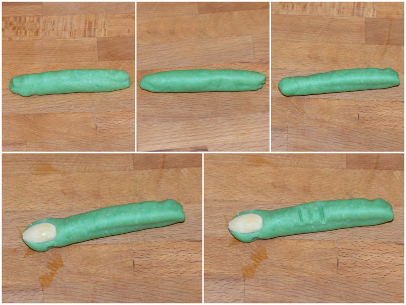 Sagomateli per creare dei cilindri, mettete la mandorla su una delle estremità e create delle piccole linee trasversali al centro del cilindro, per sagomare le nocche.