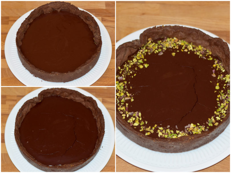 Versate la ganache nel guscio di frolla e livellate per coprire bene il ripieno al pistacchio, quindi decorate con la granella e lasciate riposare il frigo per almeno 30 minuti.