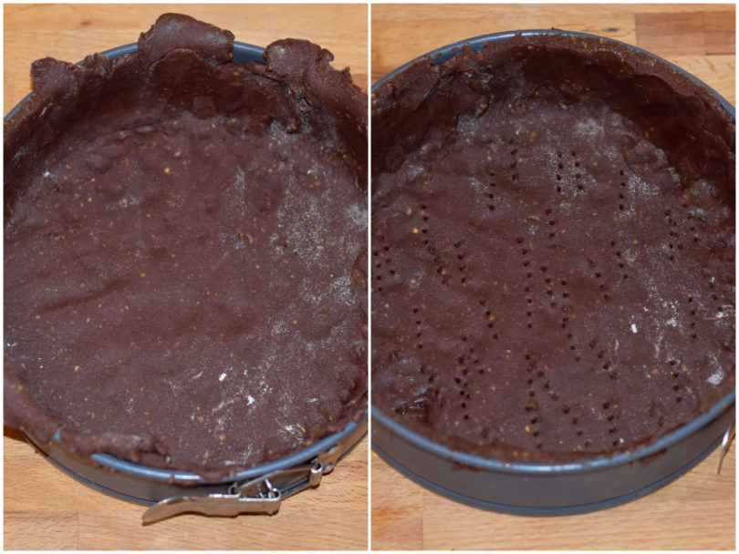 Avvolgete con pellicola per alimenti e lasciate riposare in frigo per almeno 30 minuti, quindi riprendete il panetto, stendetelo sul piano di lavoro leggermente infarinato e disponetelo nello stampo, coprendo fondo e bordi.