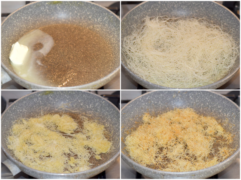 Nel frattempo sfilacciate la pasta kataifie tostatela in padella antiaderente, dove avrete già fatto sciogliere il burro, fino a farla dorare per bene, quindi lasciatela raffreddare.