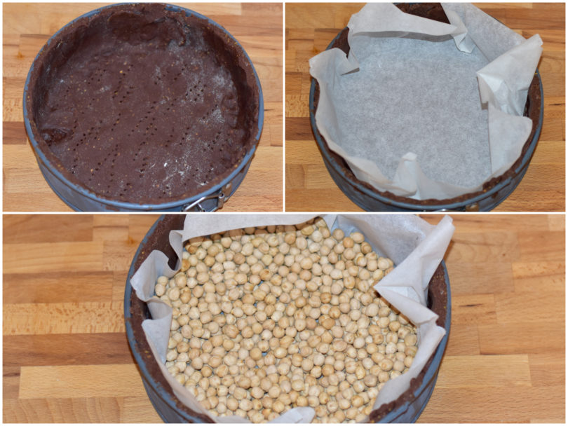 Cuocete la frolla in bianco: copritela con carta forno e distribuiteci sopra dei pesi, come legumi secchi; cuocete per circa 30 minuti in forno ventilato preriscaldato a 180°C.