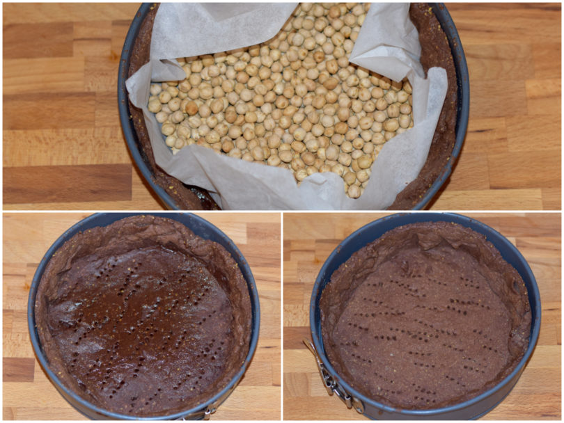 Tirate lo stampo fuori dal forno, rimuovete (facendo attenzione a non scottarvi) legumi e carta forno e infornate nuovamente per altri 5-10 minuti, quindi sfornate e lasciate raffreddare completamente.