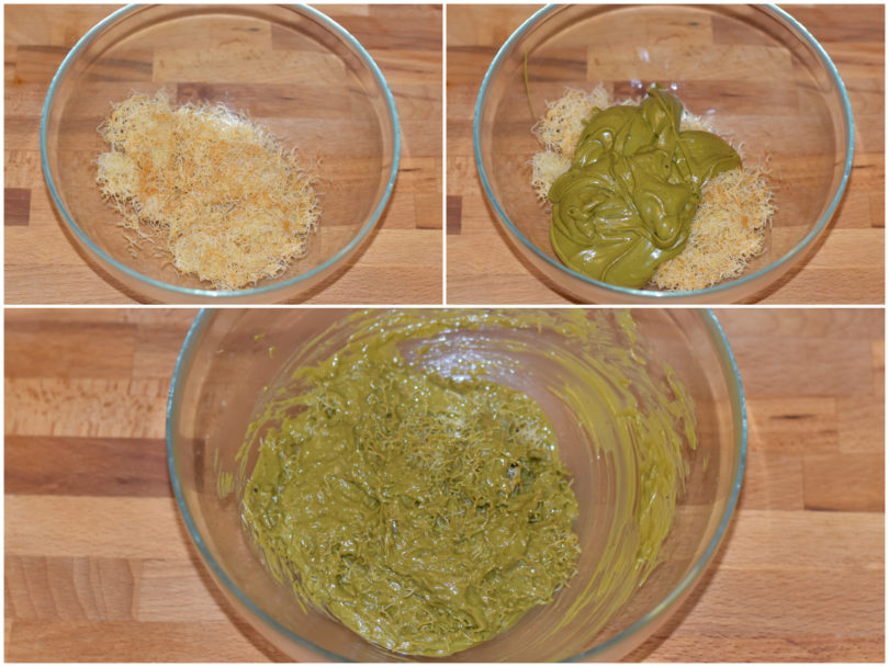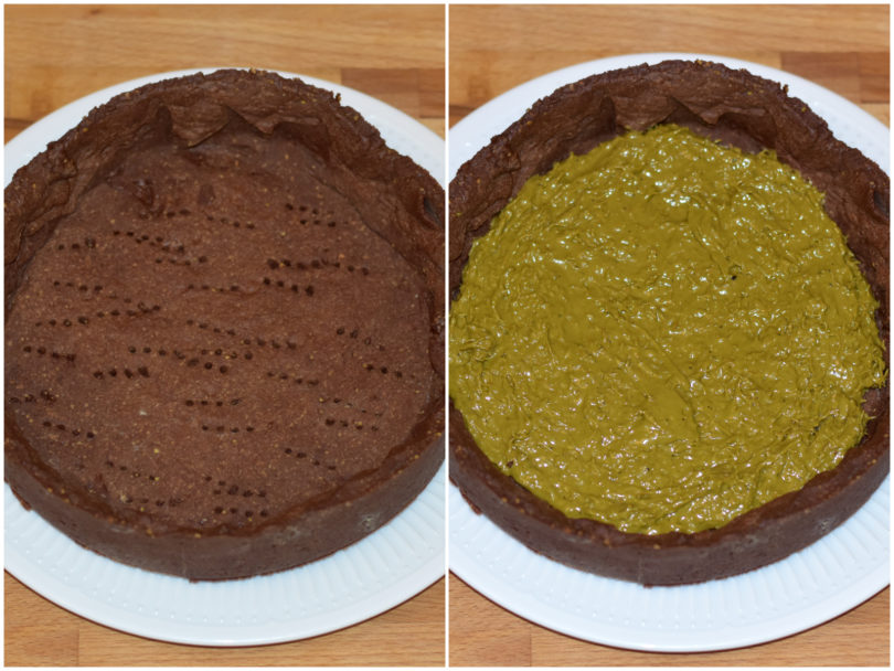 Quando la pasta kataifi sarà fedda, amalgamatela con crema di pistacchio, poi disponetela sul fondo del guscio di frolla, ormai completamente freddo, livellando bene la superficie.