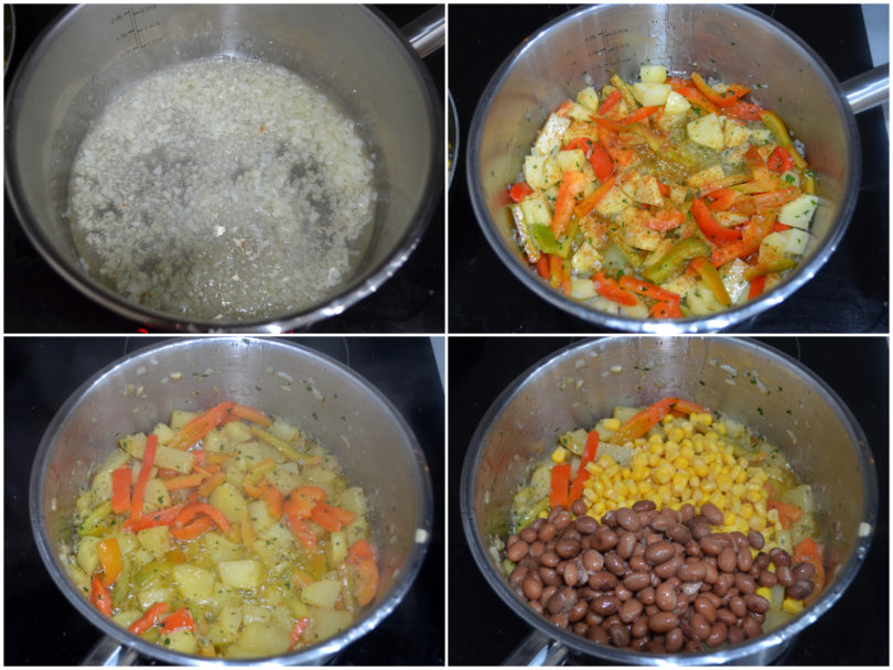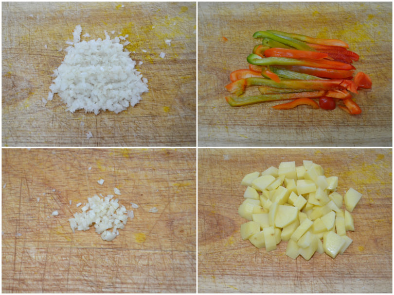Lavate e mondate tutte le le verdure, quindi tritate aglio e cipolla, e tagliate le patate a dadini e i peperoni a listarelle e poi a tocchetti.