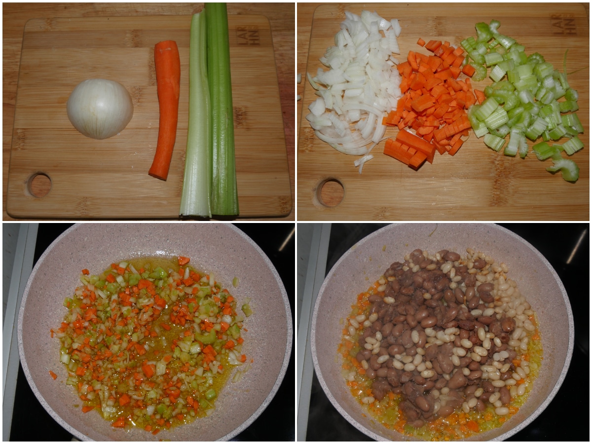 Mondate gli aromi e tritateli, quindi fateli appassire in una casseruola antiaderente con abbondante olio, poi unite aglio e fagioli.