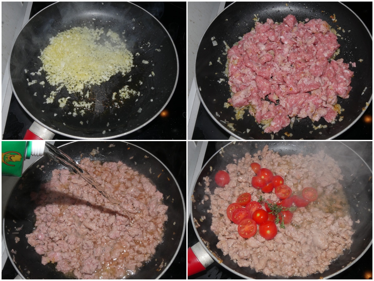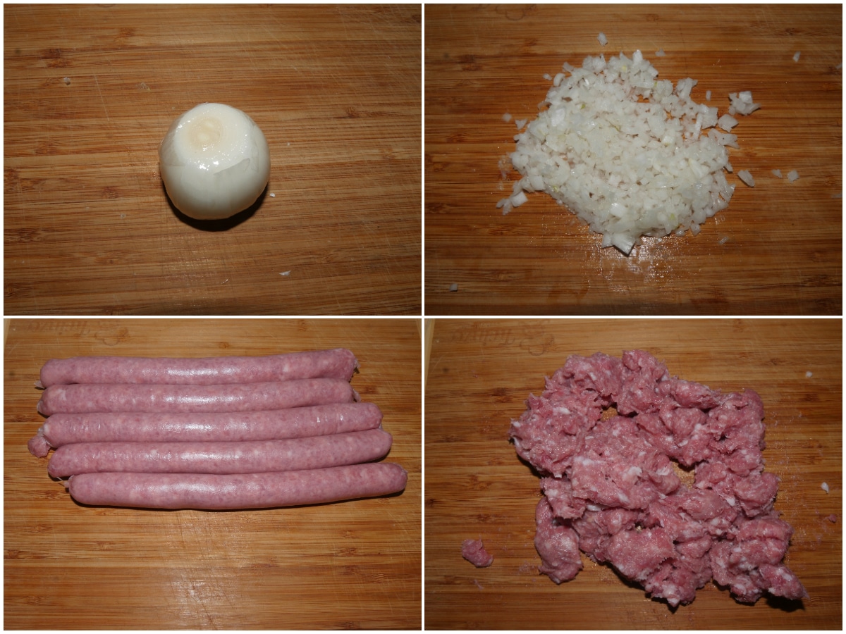 Nel frattempo mondate e tritate la cipolla e sbriciolate la salsiccia eliminando il budello.