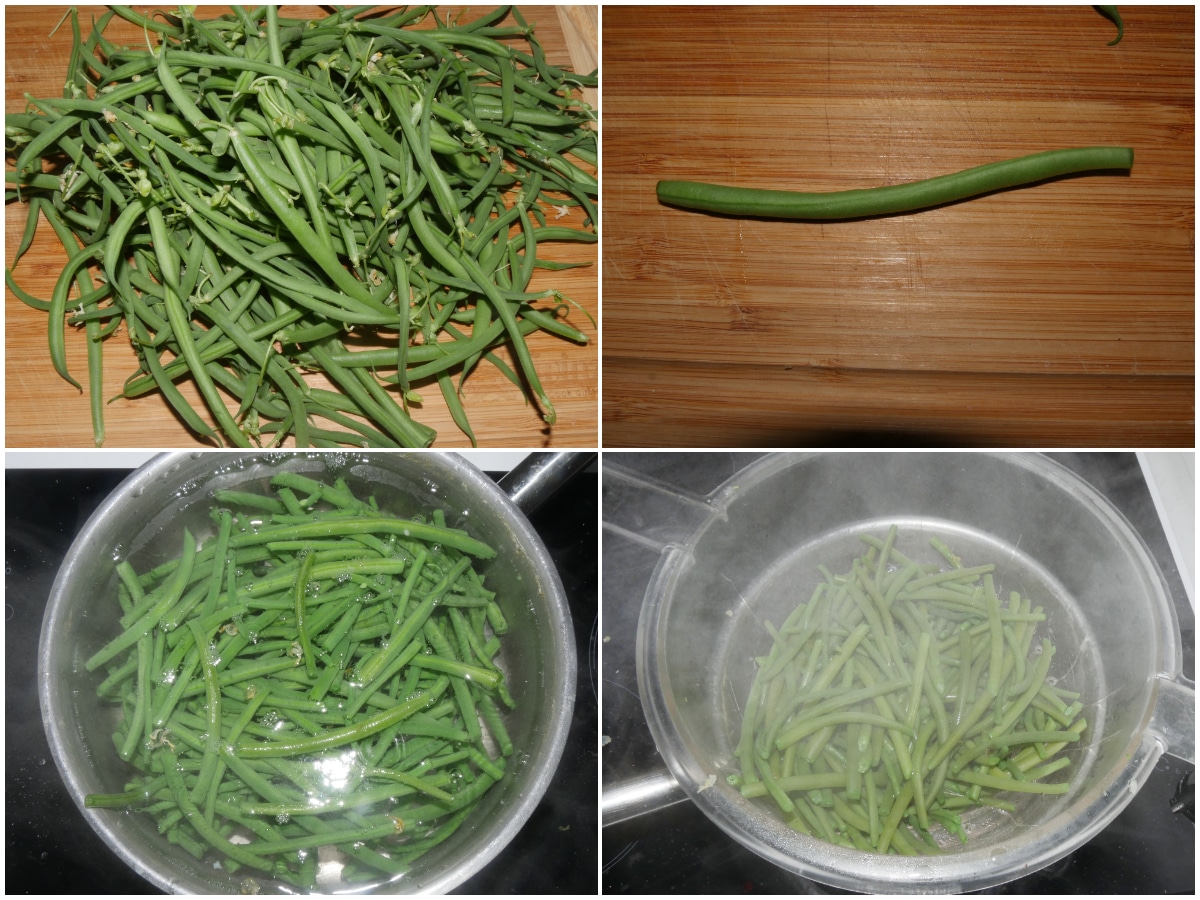 Innanzitutto pulite i fagiolini (basta tagliar via le 2 estremità), lavateli e sbollentateli per non più di 4-5 minuti in acqua bollente (in modo che risultino ancora croccantini).