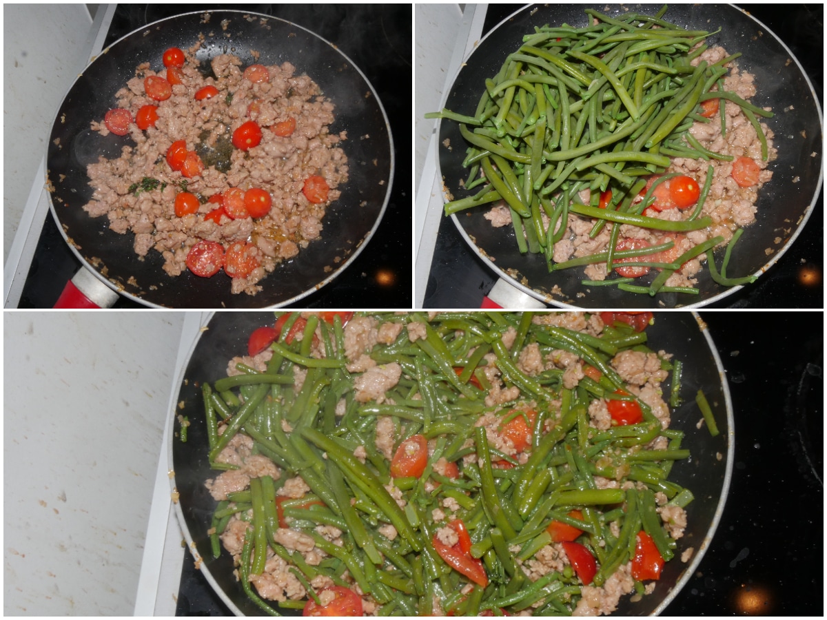 Mescolate, lasciate cuocere per qualche minuto e poi aggiungete i fagiolini, facendoli insaporire brevemente, quindi aggiustate di sale e pepe.