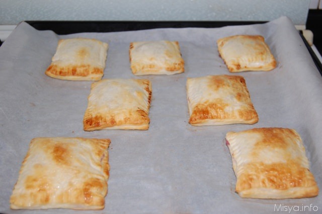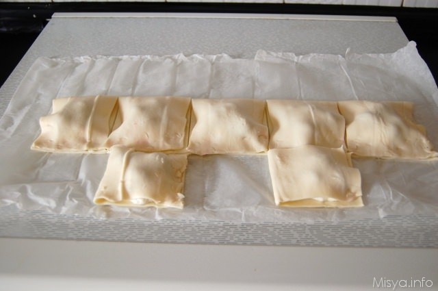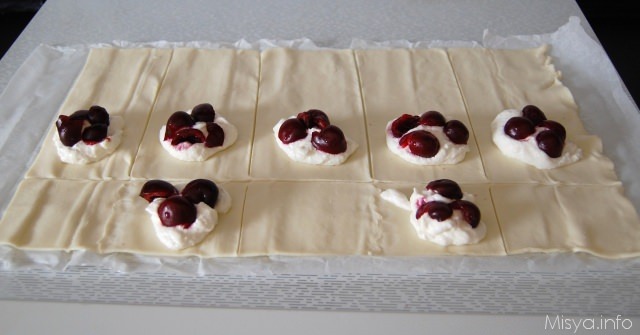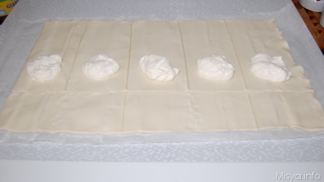 Tagliare la pasta sfoglia di 7/8 rettangoli e posizionare su un'estremità di ogni rettangolo ottenuto, un cucchiaio di crema alla ricotta