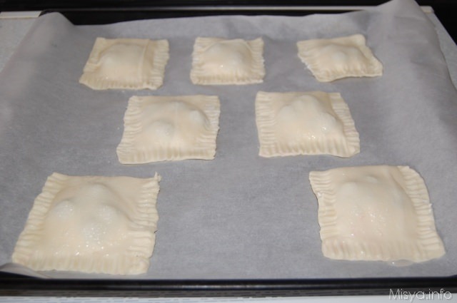 Posizionate i fagottini alla ricotta e ciliegie su una teglia ricoperta di carta forno. Mescolate in una tazzina acqua e zucchero e con quello spennellate ogni fagottino.