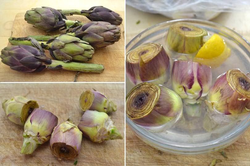 Mondate i carciofi: eliminate le foglie esterne più dure e lasciate solo il cuore tenero con un paio di cm di gambo.