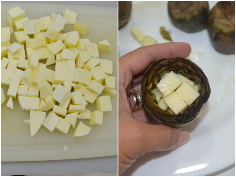Iniziate quindi a farcirli: tagliate la scamorza a cubettini e riempite il centro dei vostri carciofi.