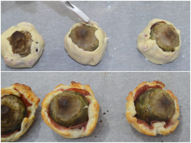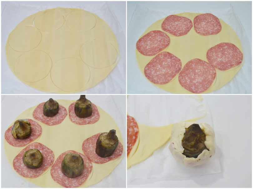 Avvolgete quindi ciascun carciofo nel salame e nella sfoglia.