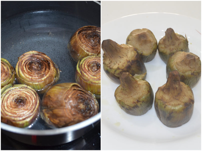 Scolate i carciofi e sbollentateli in acqua bollente salata: controllate la cottura testando i gambi con una forchetta.