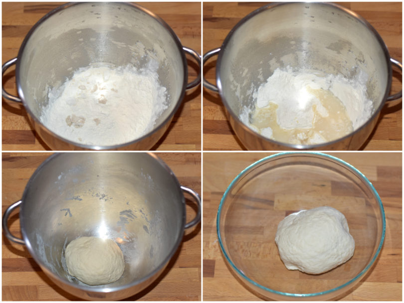 Innanzitutto preparate l'impasto: unite in una ciotola farina, zucchero e lievito; iniziate ad aggiungere l'acqua e poi anche il sale e impastate per almeno 10 minuti.