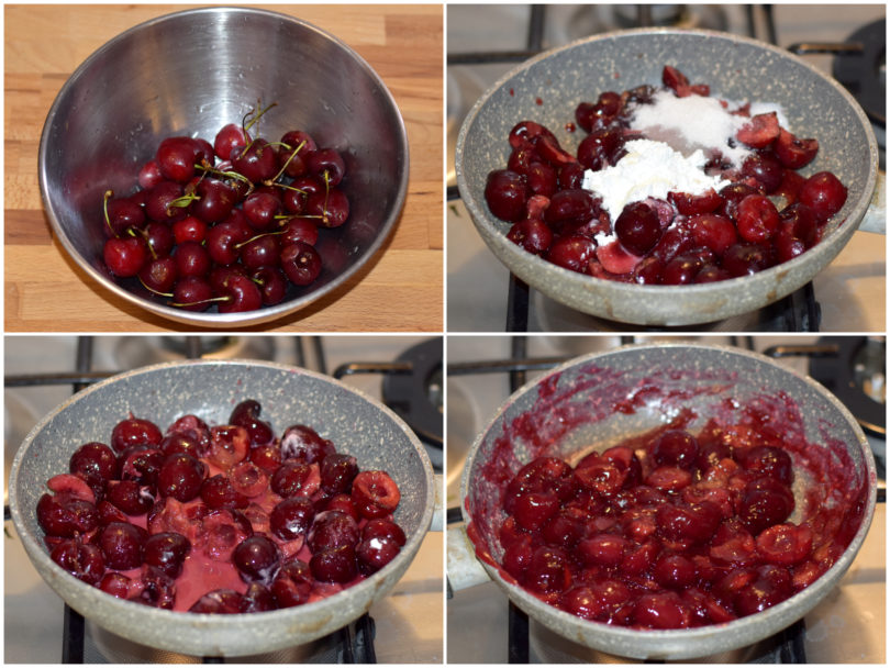 Nel frattempo occupatevi delle ciliegie: lavatele, denocciolate,e poi unitele in una casseruola antiaderente con zucchero, amido e succo di limone e lasciate cuocere a fiamma bassa per circa 15 minuti, quindi lasciare raffreddare completamente.
