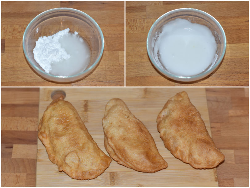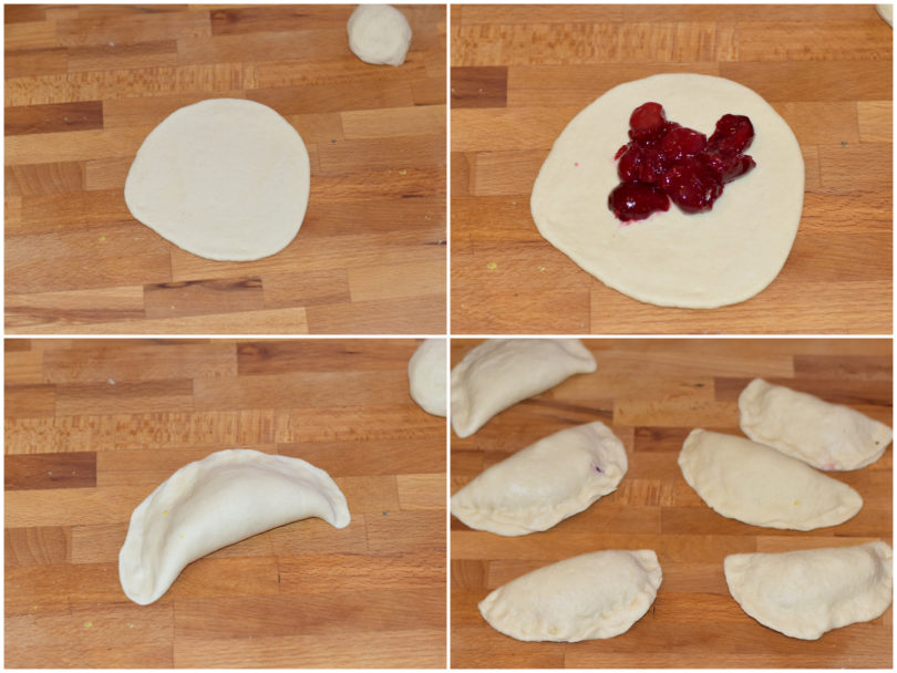 Prendete una pallina per volta, stendetela in un disco sottile, farcite al centro con un po' di ripieno e richiudete a mezzaluna sigillando bene i bordi.