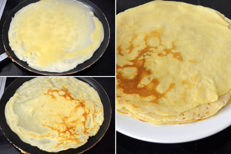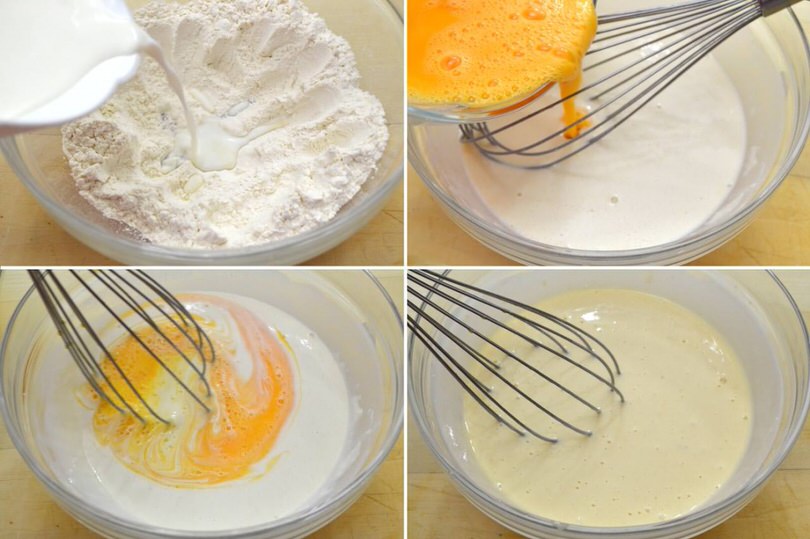 Rompete le uova in una ciotola e sbattetele con il sale con i rebbi di una forchetta. In una ciotola più grande mettete la farina, fate un buco al centro e versate il latte quindi mescolate fino ad ottenere una pastella liscia e fluida. Aggiungete ora il composto du uova e mescolate fino ad avere un composto omogeneo. Coprite la ciotola con della pellicola, quindi fate riposare la pastella per 30 minuti.
