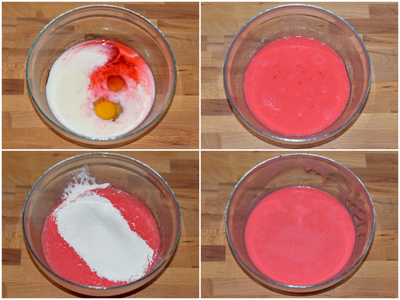 Innanzitutto preparate la pastella per le crêpes: unite in una ciotola gli ingredienti liquidi (uova, latte, olio, colorante) e amalgamate, poi incorporate anche quelli secchi (farina e zucchero) e lavorate velocemente con le fruste fino ad ottenere un composto liscio e senza grumi.