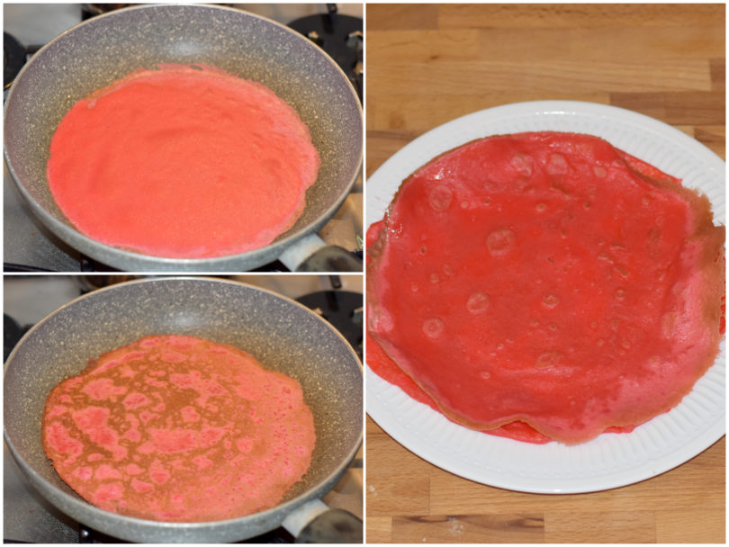 Quando i bordi inizieranno a staccarsi dalla padella, sollevate delicatamente la crêpe con una spatola, giratela per cuocere leggermente anche il secondo lato, quindi trasferitela su di un piatto e procedete con le crêpes successive, impilandole man mano sullo stesso piatto.